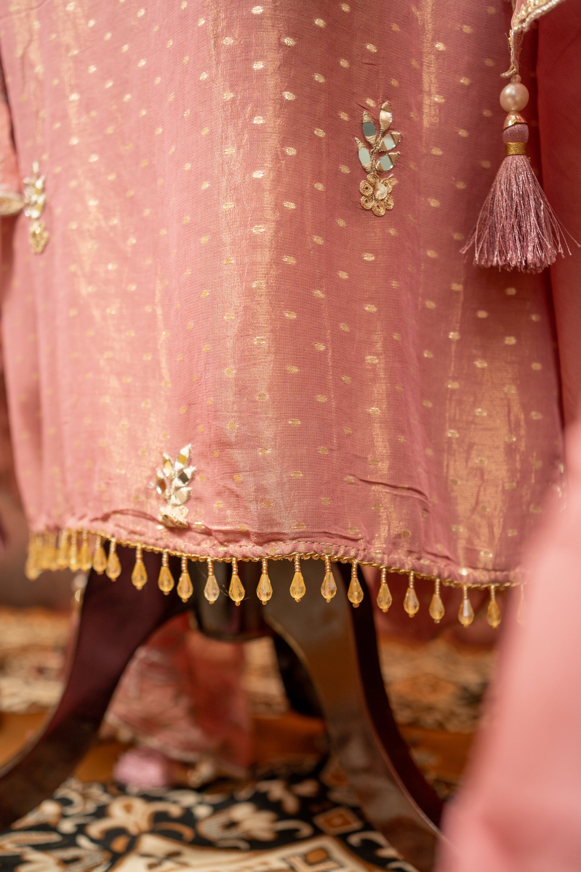 Drape yourself in luxury with this stunning Banarasi silk ensemble, a masterpiece of tradition and artistry. Adorned with intricate Gota Patti handwork, this fabric is a true celebration of India’s rich cultural heritage.