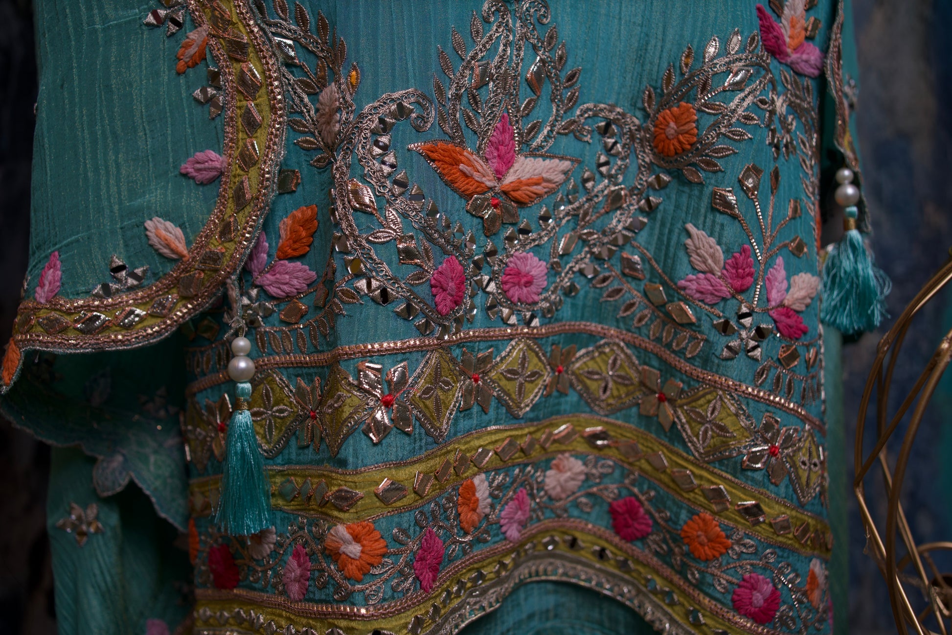 - Design: Intricate Gota Patti embroidery paired with sparkling mirror accents for a regal look.